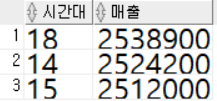 [18번 문제] 2018년 한 해 동안 오후 시간대 기준으로 매출이 가장 높았던 시간대와 매출을 구하기 (1시간 간격 기준, top3까지)